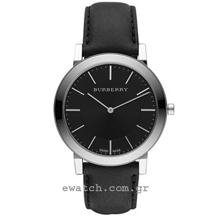 Ένα κομψό ρολόι από ανοξείδωτο ατσάλι και μαύρο δέρμα του οίκου BURBERRY.