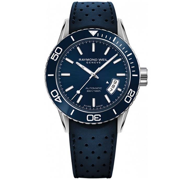 Του οίκου Raymond Weil Geneve ένα ρολόι από ανοξείδωτο ατσάλι και μπλε καντράν με αυτόματο μηχανισμό με μπλε δέρμα