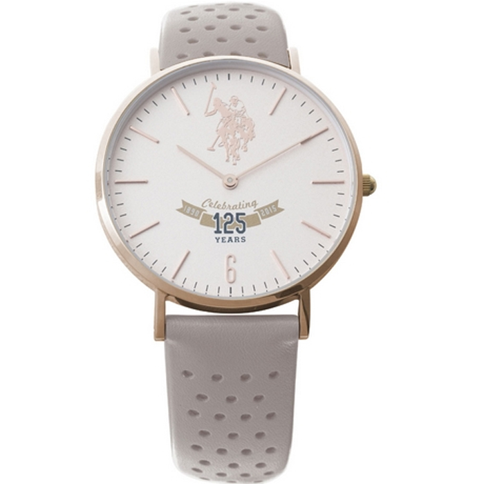 Μοντέρνο συλλεκτικό ρολόι του οίκου U.S. POLO από επιχρυσωμένο ροζ ανοξείδωτο ατσάλι και γκρι δερμάτινο λουράκι.