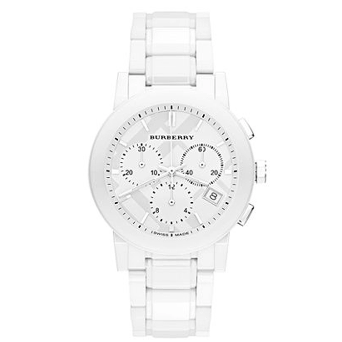 Ένα ρολόι χροvογράφος του οίκου Burberry σε κομψή γραμμή από ανοξείδωτο ατσάλι και μπρασελέ από κεραμικό.
