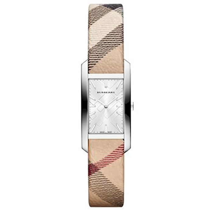 Ένα ρολόι του οίκου Burberry σε κομψή γραμμή από ανοξείδωτο ατσάλι με καφέ μπεζ και κόκκινο δερμάτινο λουράκι.