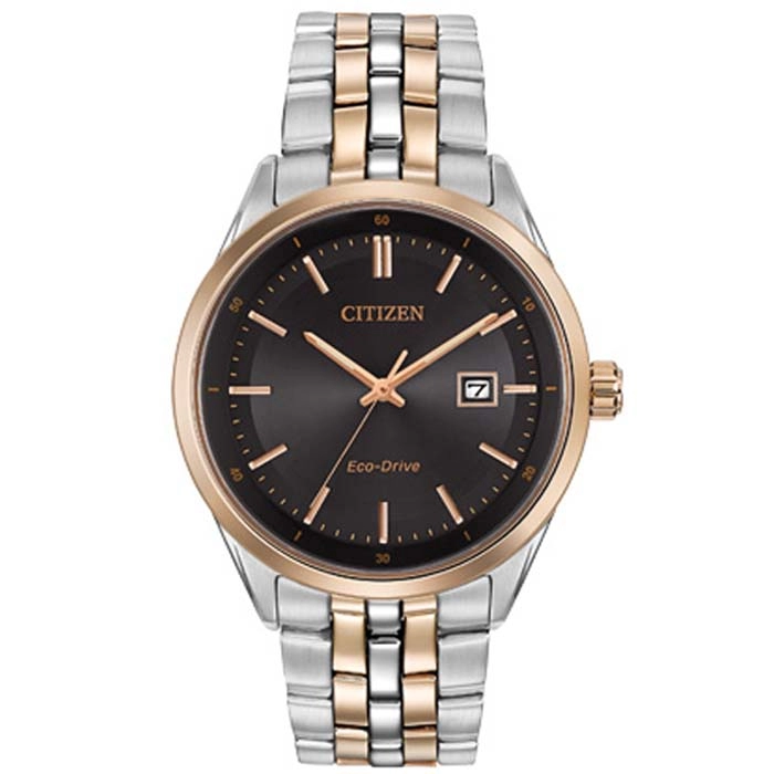 Ένα ρολόι της Citizen από ανοξείδωτο ατσάλι και επιχρυσωμένο ανοξείδωτο ατσάλι και μαύρο καντράν .