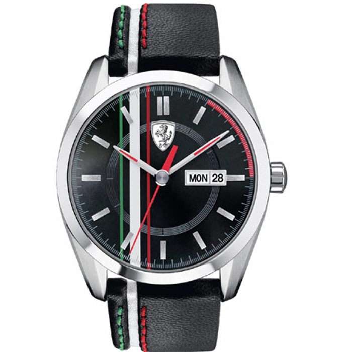 Από τον οίκο Ferrari ένα μοντέρνο ρολόι από ανοξείδωτο ατσάλι, μαύρο καντράν και μαύρο δερμάτινο λουράκι με πολύχρωμες λεπτομέρειες.