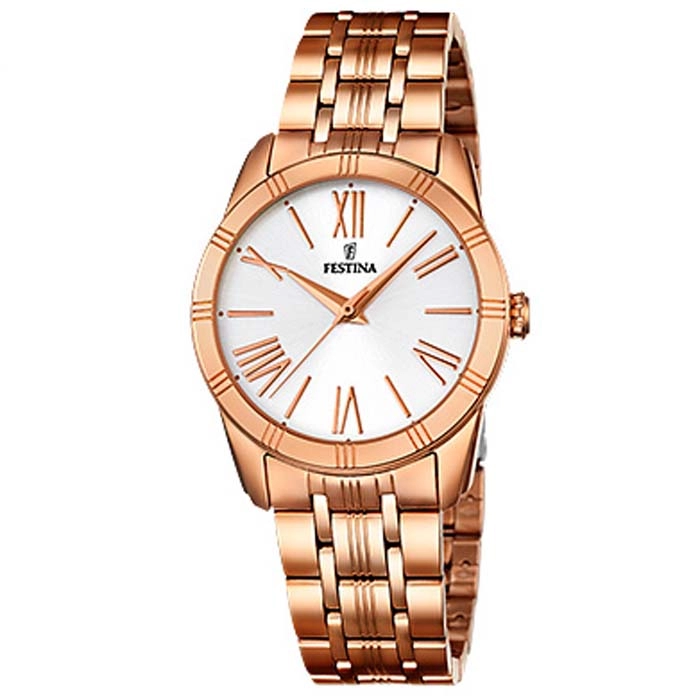 Ένα ρολόι από τη Festina από επιχρυσωμένο ροζ ανοξείδωτο ατσάλι με λευκό καντράν.