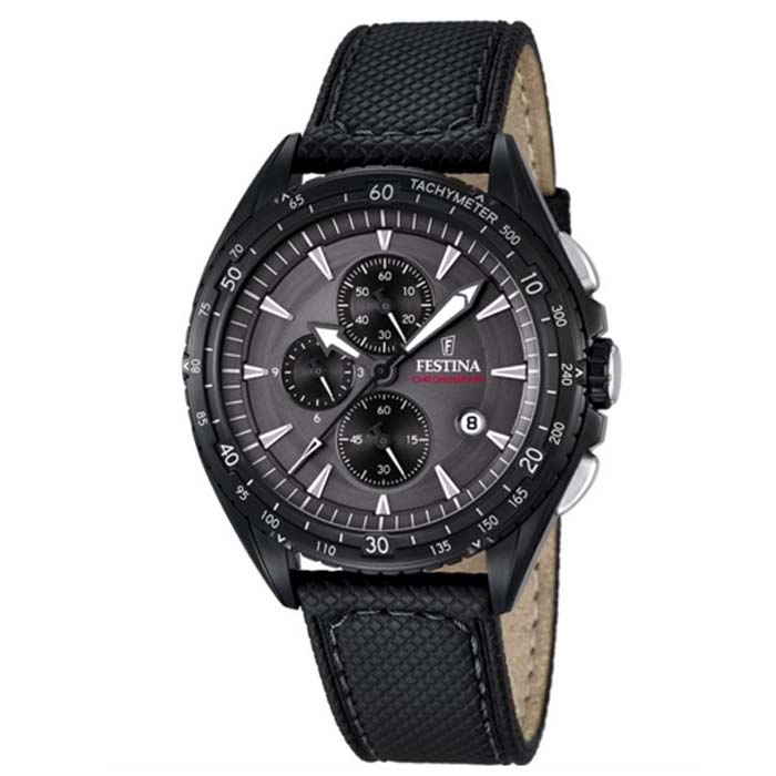Ένα σπορ ρολόι χρονογράφος του οίκου Festina από ανοξείδωτο ατσάλι με μαύρο καντράν και μαύρο δερμάτινο λουράκι