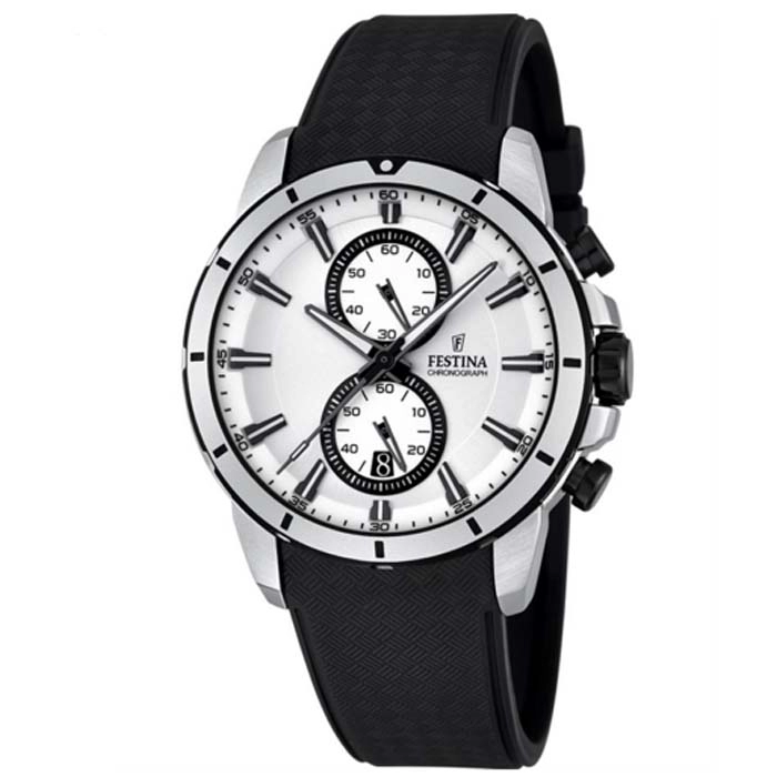 Ένα σπορ ρολόι χρονογράφος του οίκου Festina από ανοξείδωτο ατσάλι με μαύρο καντράν και μαύρο καουτσούκ λουράκι