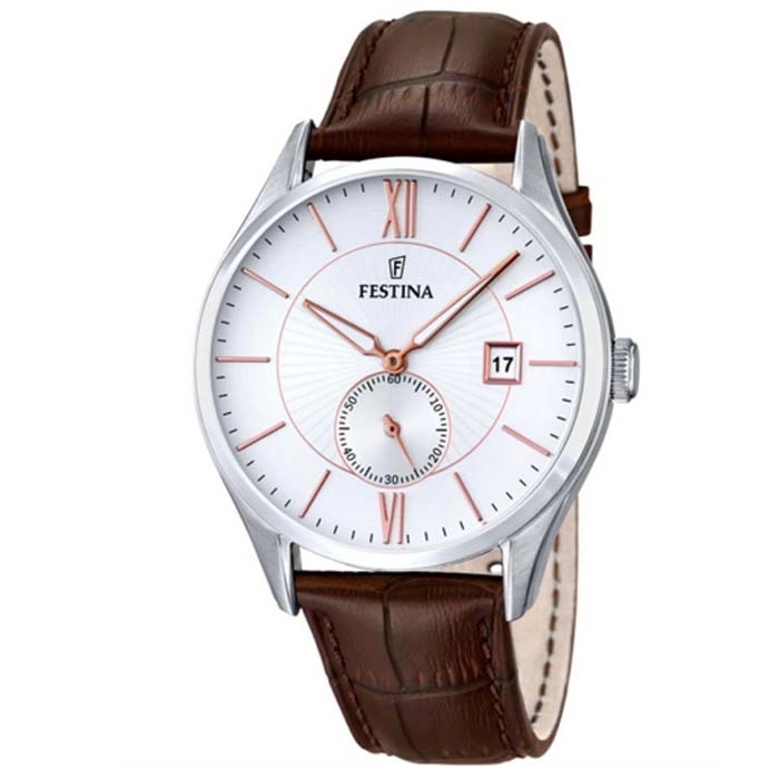 Ένα ρολόι του οίκου Festina από ανοξείδωτο ατσάλι με λευκό καντράν με καφέ δέρμα