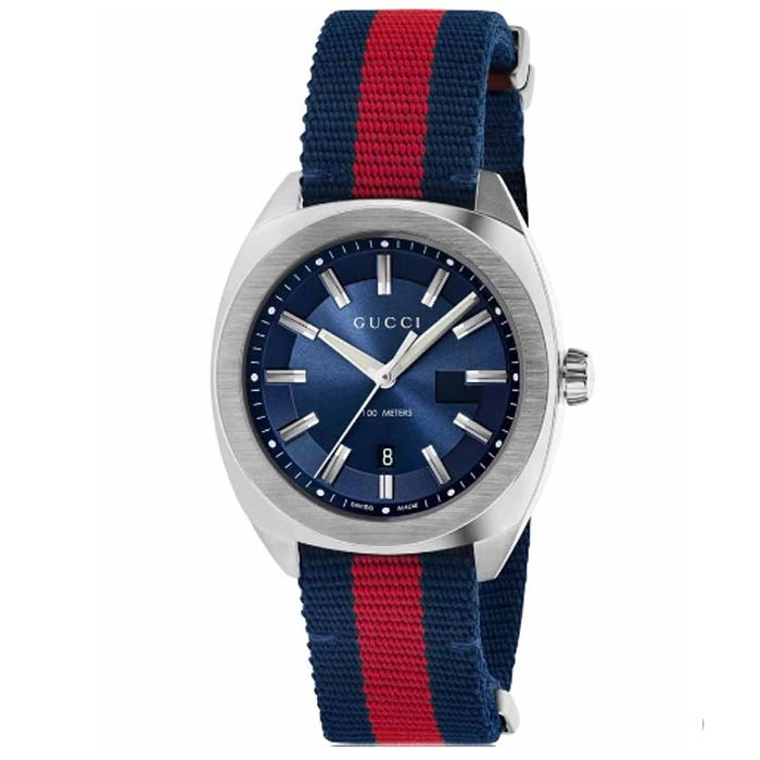 Το GG2570 είναι ένα κομψό και μοντέρνο μοντέλο της GUCCI από ανοξείδωτο ατσάλι και μπλε καντράν με δίχρωμο υφασμάτινο λουράκι