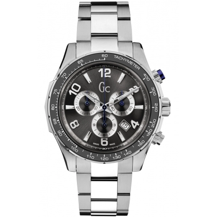 Από τη GUESS Collection ένα ρολόι χρονογράφος με ελβετικό μηχανισμό από ανοξείδωτο ατσάλι και μαύρο καντράν.