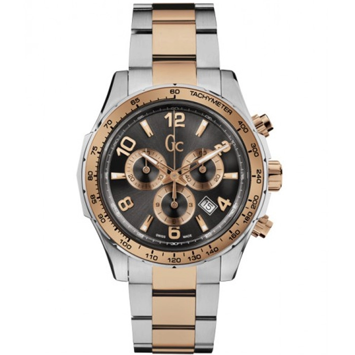 Από τη GUESS Collection ένα ρολόι χρονογράφος από επιχρυσωμένο ανοξείδωτο ατσάλι και ανοξείδωτο ατσάλι με μαύρο καντράν.