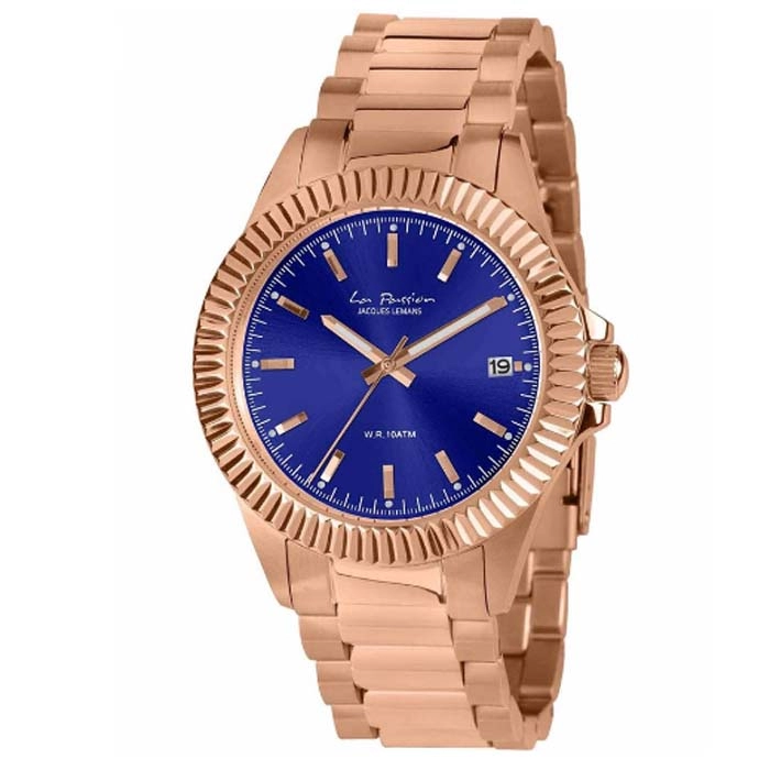 Από τη σειρά La Passion της Jacques LEMANS ένα ρολόι από επιχρυσωμένο ανοξείδωτο ατσάλι και μπλε καντράν.