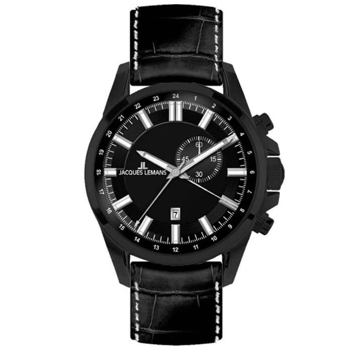 Από τη σειρά Liverpool της Jacques LEMANS ένα ρολόι από ανοξείδωτο ατσάλι, μαύρο καντράν και μαύρο δερμάτινο λουράκι.