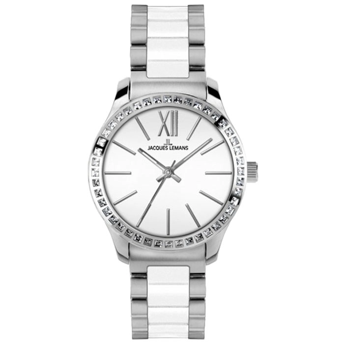 Ξεχωριστό γυναικείο ρολόι του οίκου Jacques LEMANS από ανοξείδωτο ατσάλι με λευκό κεραμικό και κρύσταλλα.