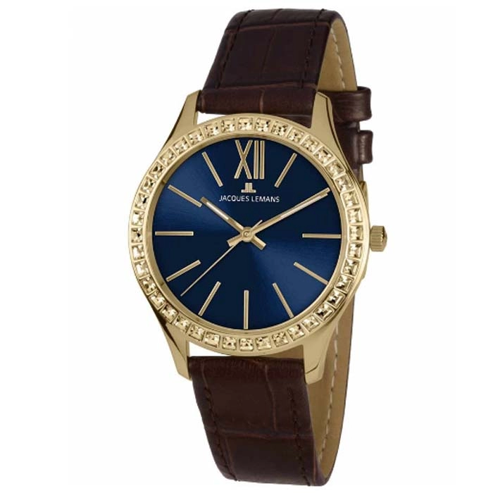 Από τον οίκο Jacques Le Mans της σειράς Rome, ένα ξεχωριστό ρολόι από χρυσό ανοξείδωτο ατσάλι, καφέ δερμάτινο λουράκι και μπλε καντράν με κρύσταλλα