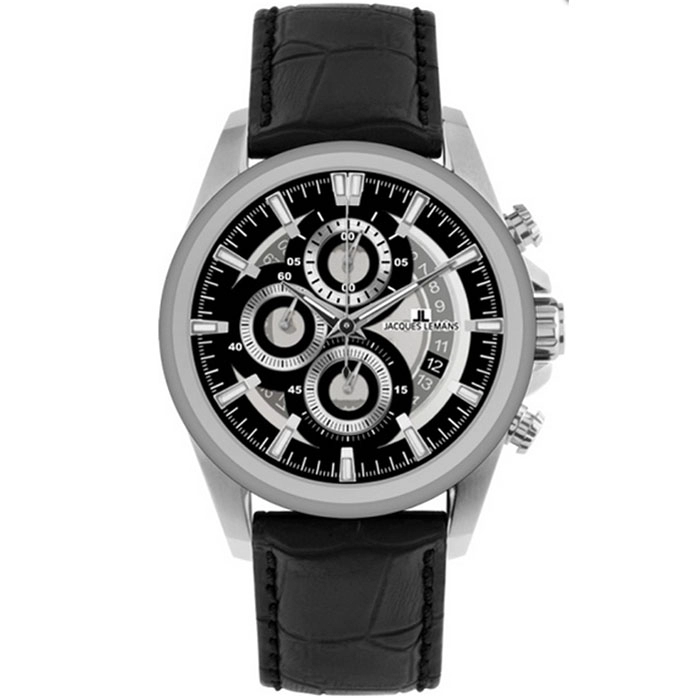 Μοντέρνος χρονογράφος του οίκου Jacques LEMANS της σειράς Liverpool, από ανοξείδωτο ατσάλι και μαύρο δερμάτινο λουράκι.