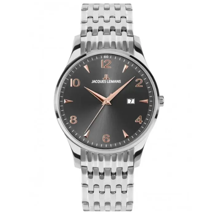Ένα όμορφο ρολόι από ανοξείδωτο ατσάλι που ακολουθεί κλασική σχεδιαστική γραμμή με μοντέρνες πινελιές. Μία εξαιρετική πρόταση της JACQUES LEMANS.