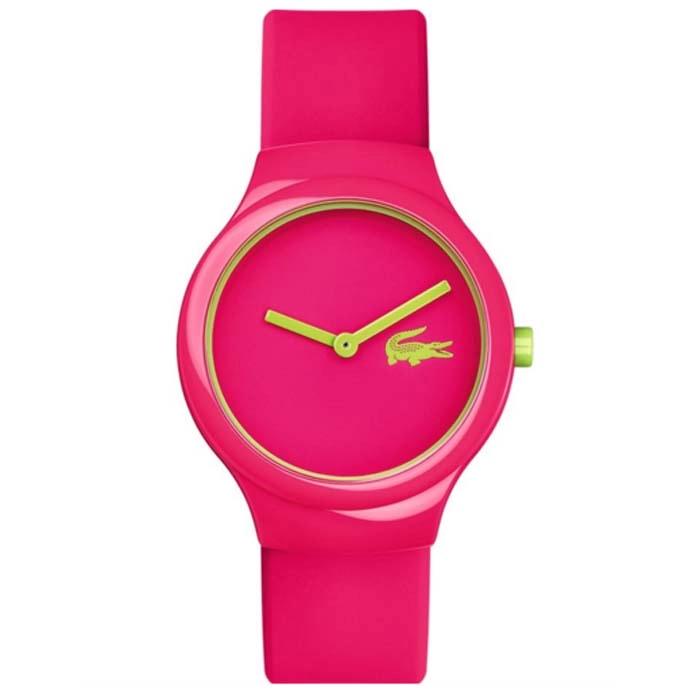 Από τον οίκο Lacoste ενα μοντέρνο ρολόι της σειράς Goa απο πλαστικό με φούξια καντράν και φούξια καουτσούκ λουράκι
