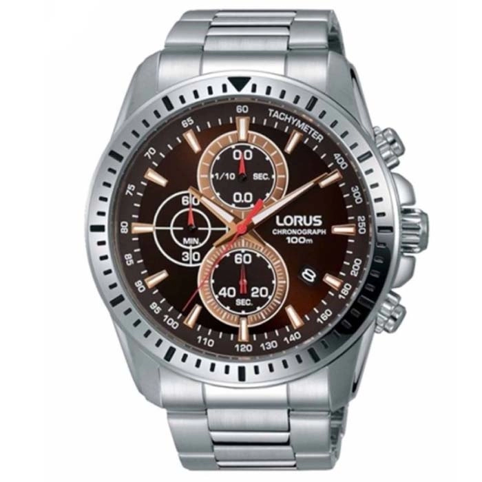 Από τη σειρά SPORTS της Lorus ένας χρονογράφος από ανοξείδωτο ατσάλι, με καφέ καντράν