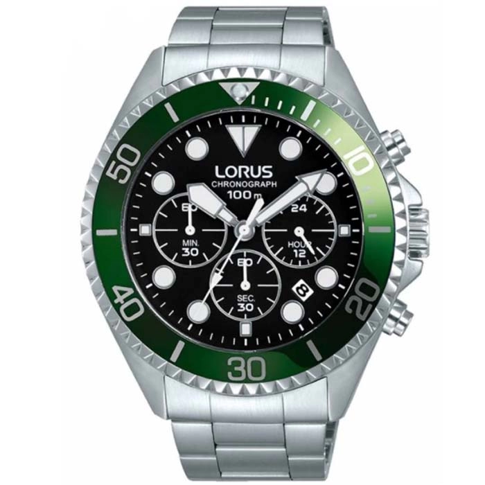 Από τη σειρά SPORTS της Lorus ένας χρονογράφος από ανοξείδωτο ατσάλι, με μαύρο καντράν