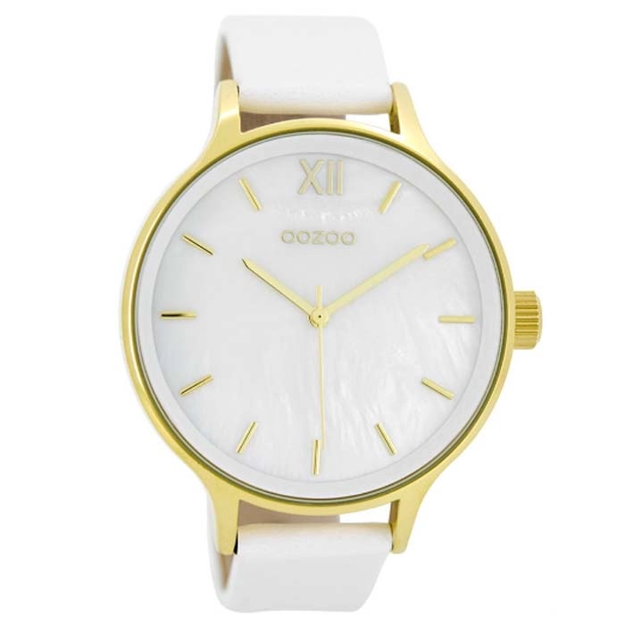 Ένα μοντέρνο ρολόι του οίκου OOZOO με ροζ χρυσό μεταλλικό πλαίσιο, μπεζ καντράν και μπεζ λουράκι.