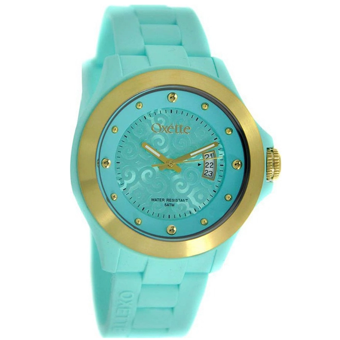 Ένα γυναικείο μοντέρνο ρολόι από επιχρυσωμένο ανοξείδωτο ατσάλι και τυρκουάζ λουράκι.