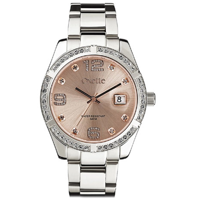Εντυπωσιακό ρολόι της OXETTE από ανοξείδωτο ατσάλι με κρύσταλλα και ροζ χρυσό καντράν.