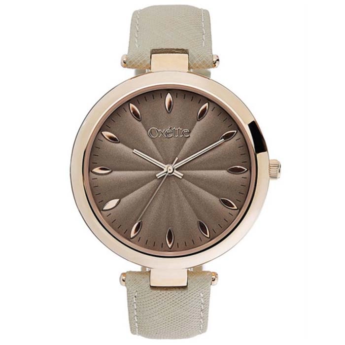 Εντυπωσιακό ρολόι της OXETTE από ροζ ανοξείδωτο ατσάλι και καφέ καντράν με μπεζ δέρμα