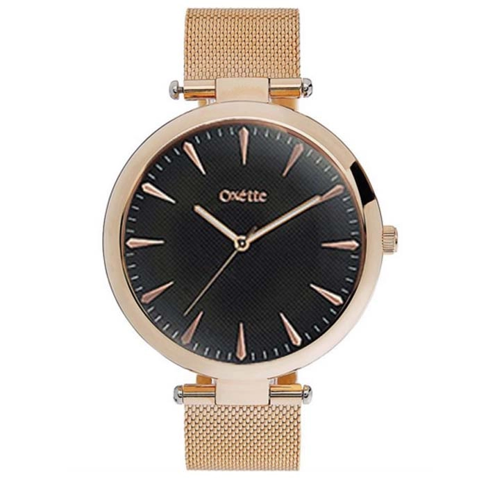 Εντυπωσιακό ρολόι της OXETTE από ροζ χρυσό ανοξείδωτο ατσάλι και μαύρο καντράν