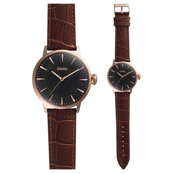 Εντυπωσιακό ρολόι της OXETTE από ροζ χρυσό ανοξείδωτο ατσάλι και μαύρο καντράν με καφέ δέρμα