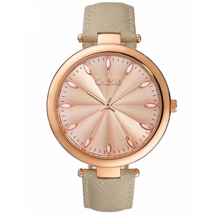 Εντυπωσιακό ρολόι της OXETTE από ροζ ανοξείδωτο ατσάλι και ροζ χρυσό καντράν με γκρι δέρμα