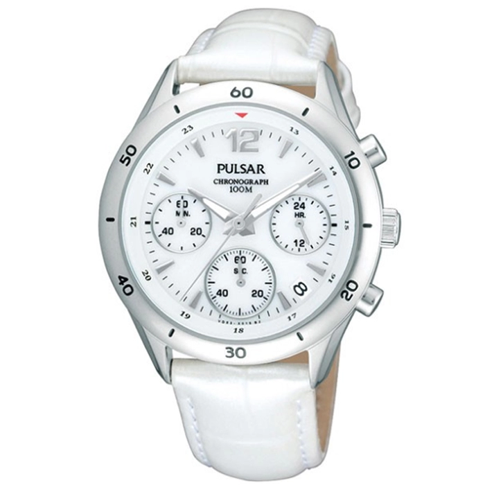 Ένας χρονογράφος της Pulsar από ανοξείδωτο ατσάλι και λευκό δερμάτινο λουράκι.