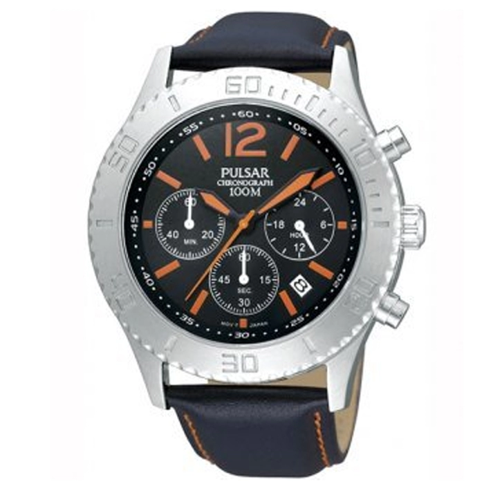 Ένας χρονογράφος της Pulsar από ανοξείδωτο ατσάλι, μαύρο καντράν με κόκκινες λεπτομέρειες και μαύρο δερμάτινο λουράκι.