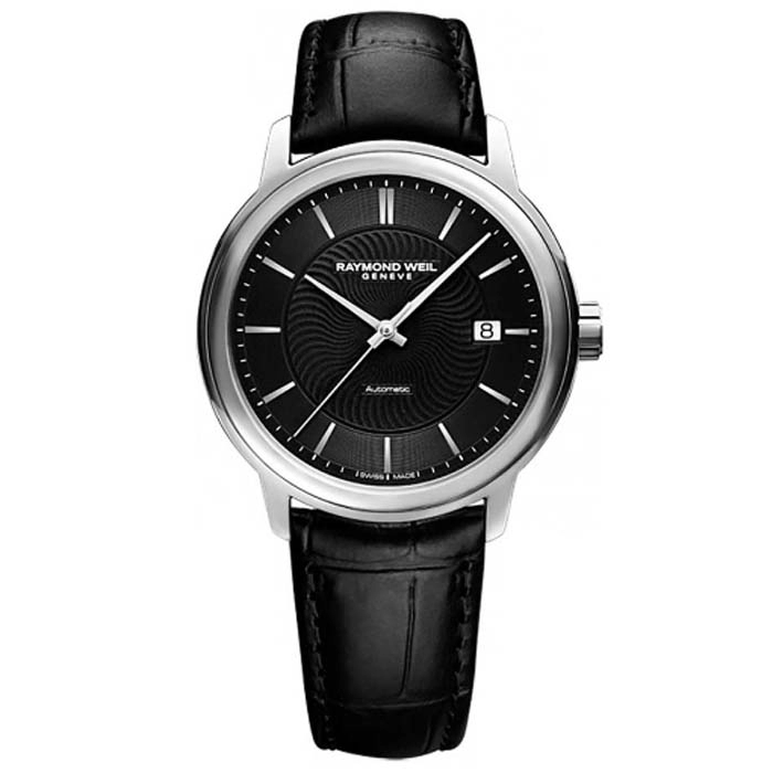 Του οίκου Raymond Weil Geneve ένα ρολόι από ανοξείδωτο ατσάλι με μαύρο καντράν και αυτόματο μηχανισμό με μαύρο δερμάτινο λουράκι