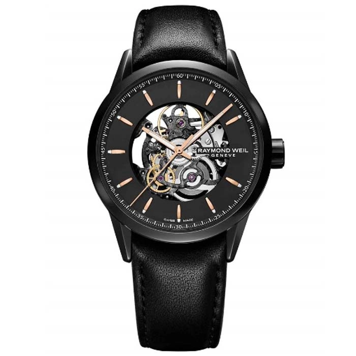 Του οίκου Raymond Weil Geneve ένα ρολόι από ανοξείδωτο ατσάλι και skeleton καντράν αυτόματο μηχανισμό και μαύρο δερμάτινο λουράκι
