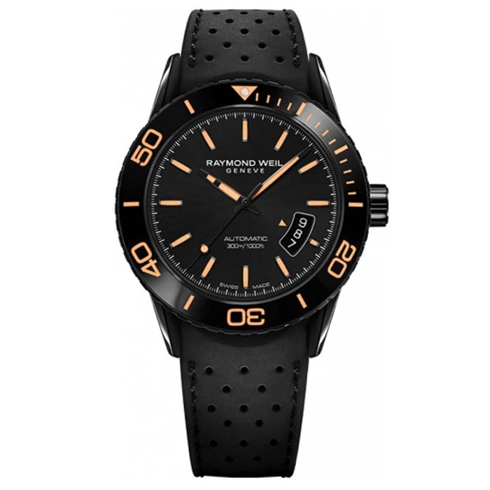 Του οίκου Raymond Weil Geneve ένα ρολόι από ανοξείδωτο ατσάλι με μαύρο καντράν και αυτόματο μηχανισμό με μαύρο λουράκι απο καουτσούκ