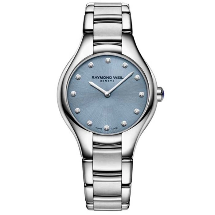 Ένα ρολόι του οίκου Raymond Weil Geneve από ανοξείδωτο ατσάλι με γαλάζιο καντράν και 12 διαμαντάκια.