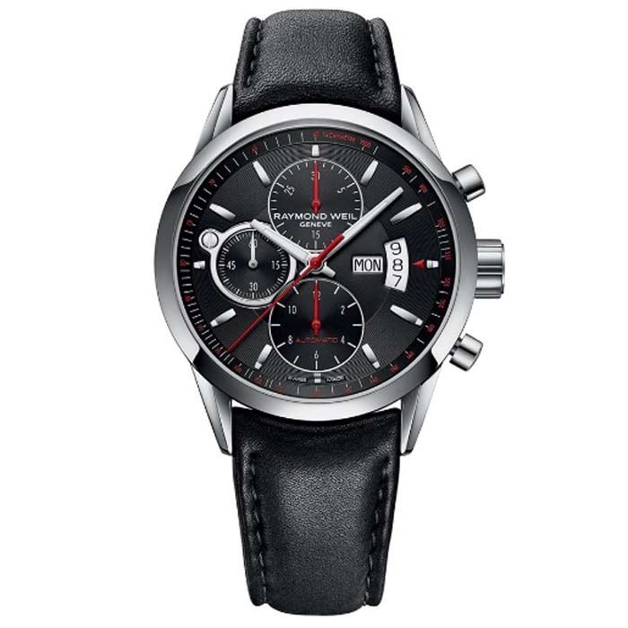 Ένα ρολόι του οίκου Raymond Weil Geneve από ανοξείδωτο ατσάλι με αυτόματο μηχανισμό, χρονογράφο και μαύρο δερμάτινο λουράκι.