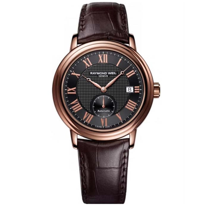 Του οίκου Raymond Weil Geneve ένα ρολόι από ροζ ανοξείδωτο ατσάλι με μαύρο καντράν και αυτόματο μηχανισμό με καφέ δερμάτινο λουράκι