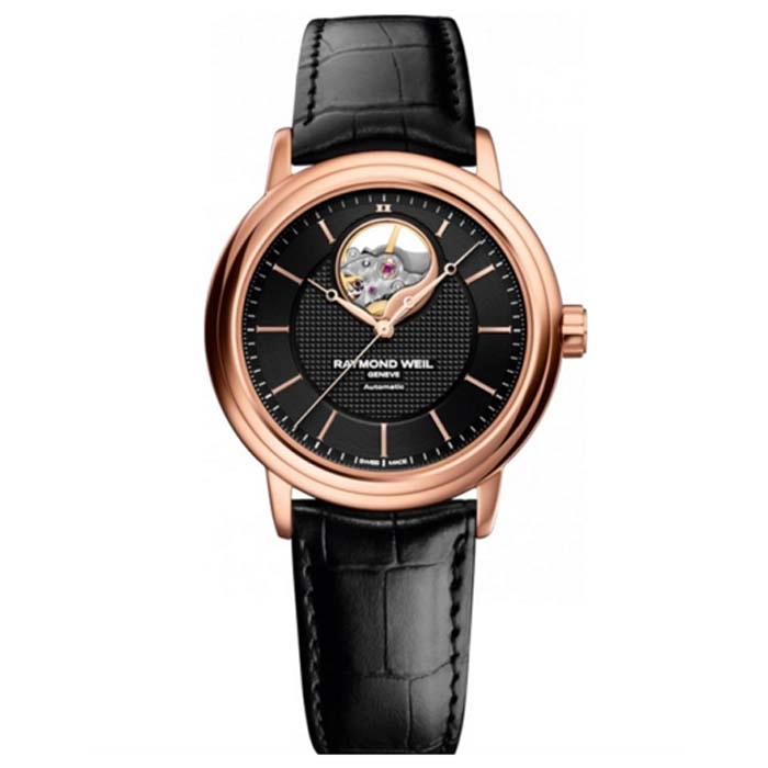 Του οίκου Raymond Weil Geneve ένα ρολόι από ροζ ανοξείδωτο ατσάλι με μαύρο καντράν και αυτόματο μηχανισμό με μαύρο δερμάτινο λουράκι