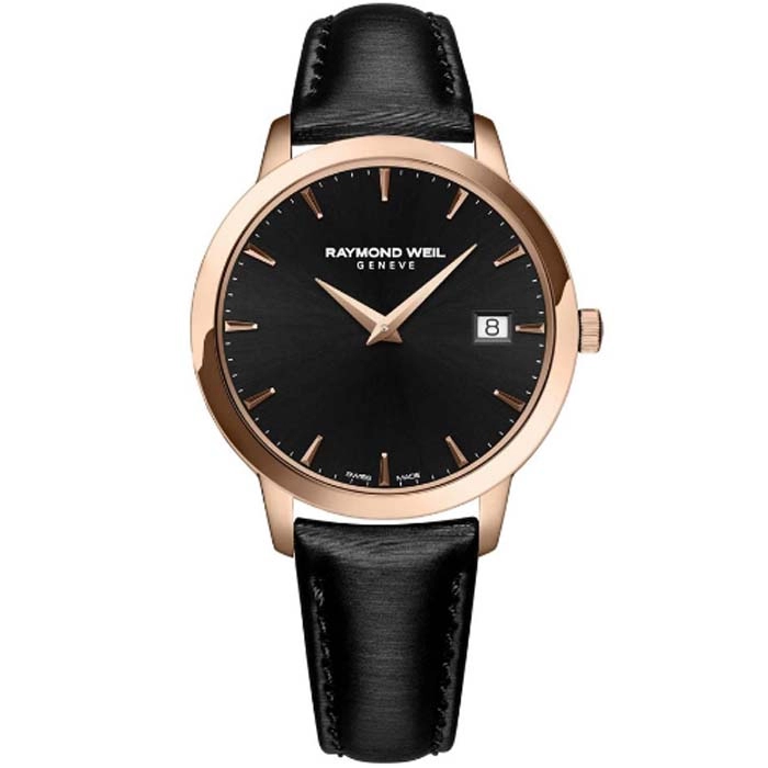 Του οίκου Raymond Weil Geneve ένα ρολόι από ροζ επιχρυσωμένο ανοξείδωτο ατσάλι με μαύρο καντράν και μαύρο δέρμα