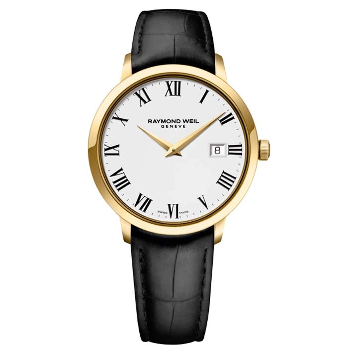 Του οίκου Raymond Weil Geneve ένα ρολόι από ανοξείδωτο ατσάλι με λευκό καντράν και μαύρο δερμάτινο λουράκι