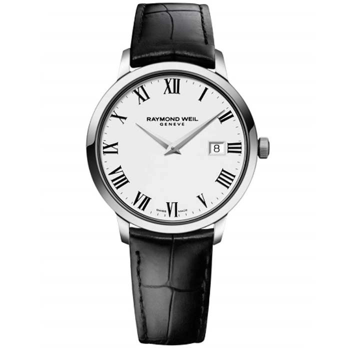 Του οίκου Raymond Weil Geneve ένα ρολόι από ανοξείδωτο ατσάλι με λευκό καντράν και μαύρο δέρμα