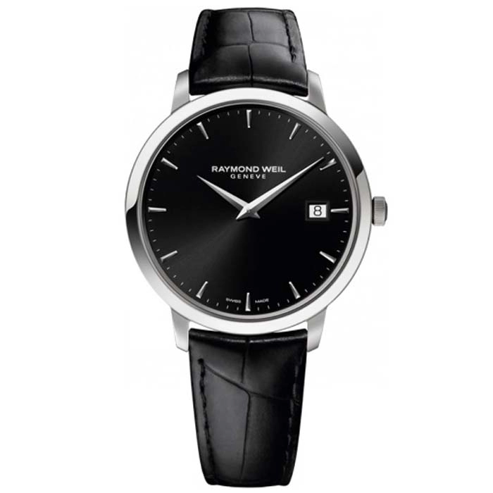 Του οίκου Raymond Weil Geneve ένα ρολόι από ανοξείδωτο ατσάλι με μαύρο καντράν με μαύρο δερμάτινο λουράκι