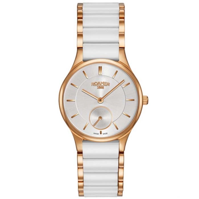 Από τον οίκο Roamer της σειράς Ceraline Saphira ένα εντυπωσιακό ρολόι από ροζ χρυσό ανοξείδωτο ατσάλι και λευκό κεραμικό με ασημί καντράν