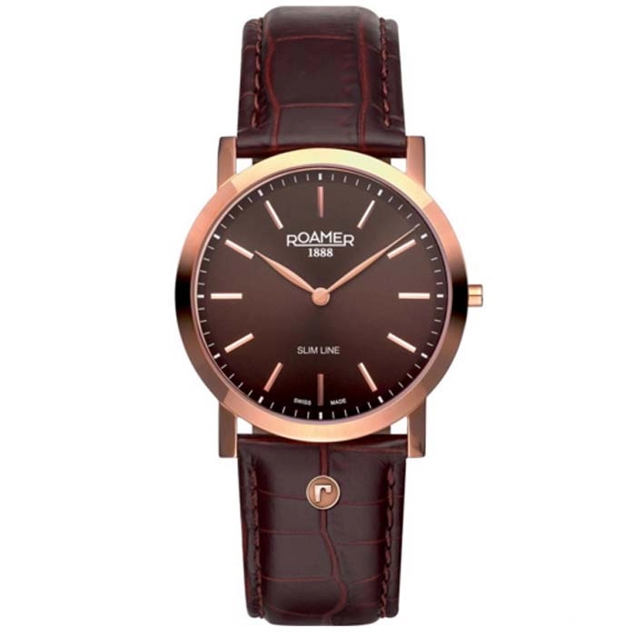 Από τον οίκο Roamer της σειράς Slim Line ένα ρολόι από ροζ ανοξείδωτο ατσάλι με καφέ καντράν και καφέ δερμάτινο λουράκι