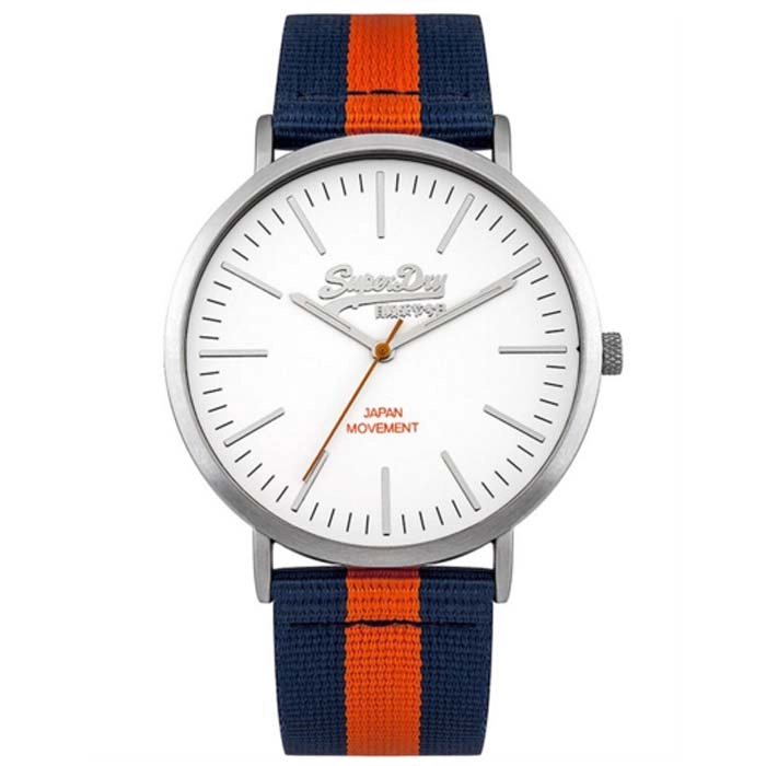 Ξεχωριστό ρολόι της εταιρίας SUPERDRY από ανοξείδωτο ατσάλι λευκό καντράν και μπλε με κόκκινο υφασμάτινο λουράκι