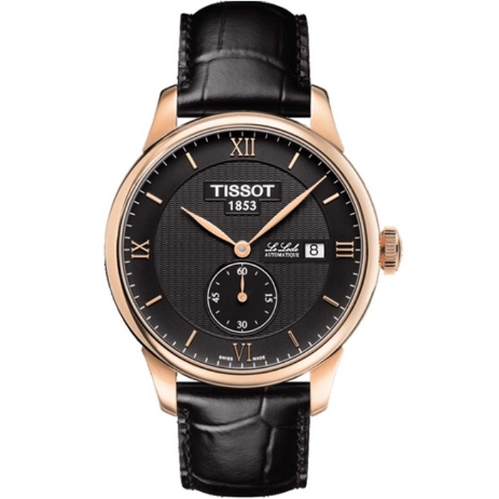 Aπό τη σειρά Le Locle του οίκου Tissot από επιχρυσωμένο ροζ ανοξείδωτο ατσάλι και μαύρο καντράν με μαύρο δερμάτινο λουράκι.