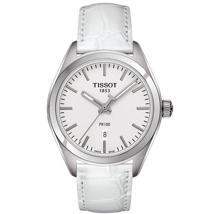 Ρολόι της σειράς Classic PR 100 του οίκου Tissot από ανοξείδωτο ατσάλι με λευκό καντράν και λευκό δερμάτινο λουράκι σε κλασσικές γραμμές.