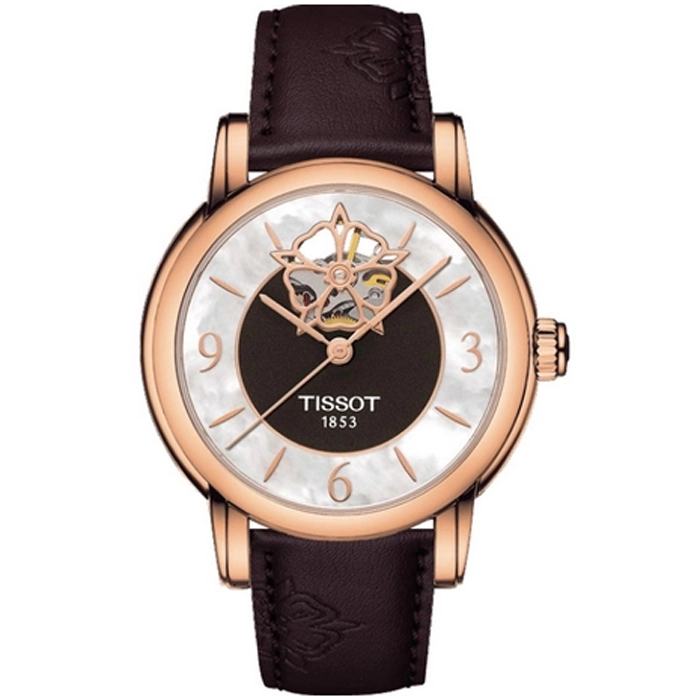Μοντέρνο ρολόι της σειράς Lady Heart του οίκου Tissot από επιχρυσωμένο ανοξείδωτο ατσάλι και φίλντεσι καντράν με εμφανή το μηχανισμό του.