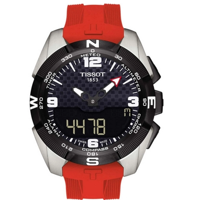 Ένα ιδιαίτερο και εντυπωσιακό ρολόι από την TISSOT από τιτάνιο με κόκκινο καουτσούκ λουράκι και μαύρο anadigi καντράν αφής επαναφορτιζόμενο από το ηλιακό φως